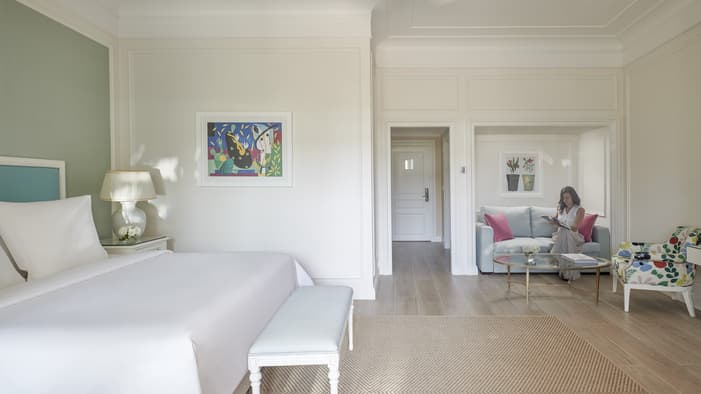 Experience the glamour of our coastal Resort, featuring a seafront with an assortment of rooms, beach suites and sea-view villas with private pools, as well as a palace. Each room and suite is inspired by European-Mediterranean style, showcasing a colour palette that spans from cool pastels to the vivid tones of the sea. The artful décor includes paintings and sculptures that evoke the essence of summer beach holidays, complemented by views of the sea and sky.