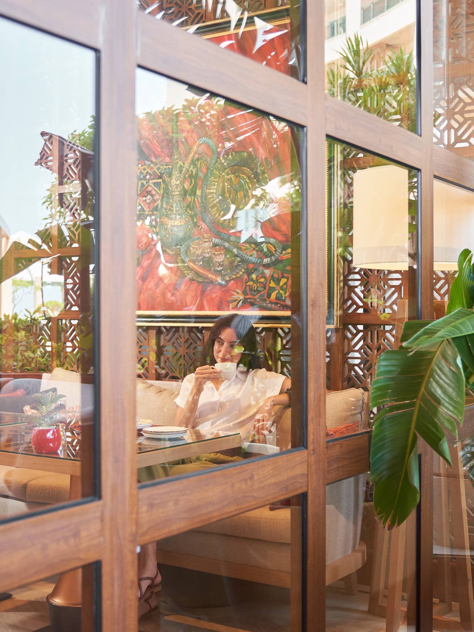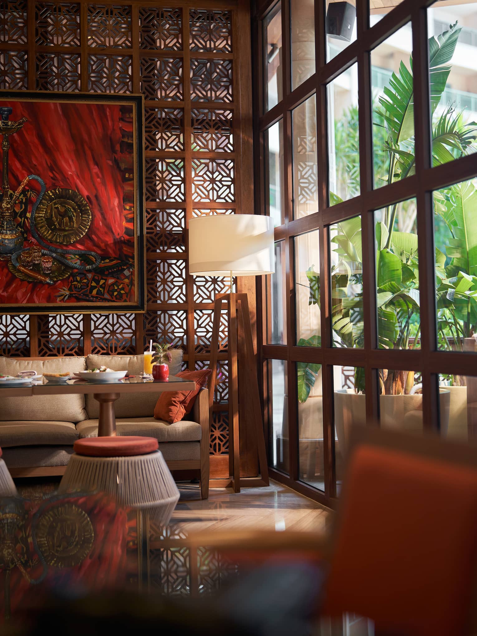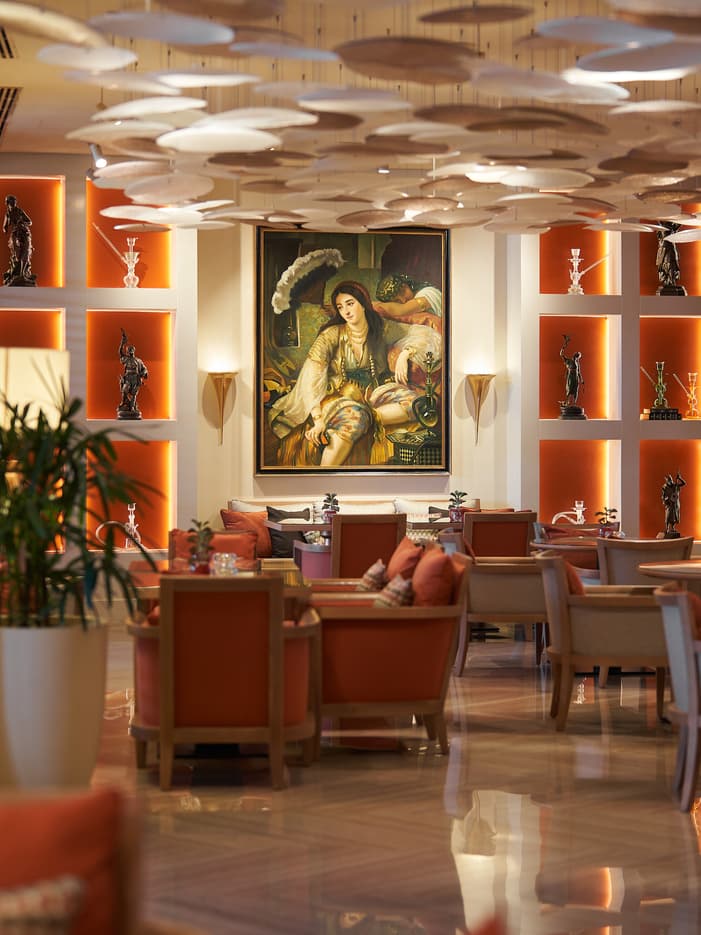 Take a seat overlooking the Mediterranean to enjoy plates of hot and cold mezzeh and authentic Lebanese and Syrian favourites, surrounded by elaborate woodworking, gilded ceilings and views of the Mediterranean, in our elegant formal restaurant.