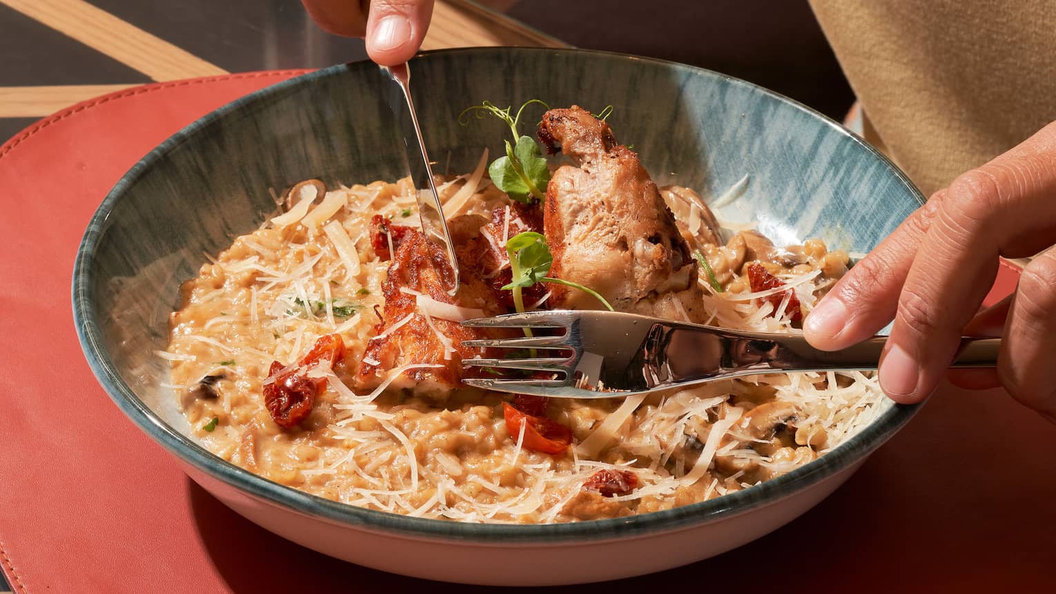 Pan-Roasted Chicken RouladeWild Mushrooms, Wheat Risotto, Akawi, Cheese-Stuffed Chicken, Truffle Oil