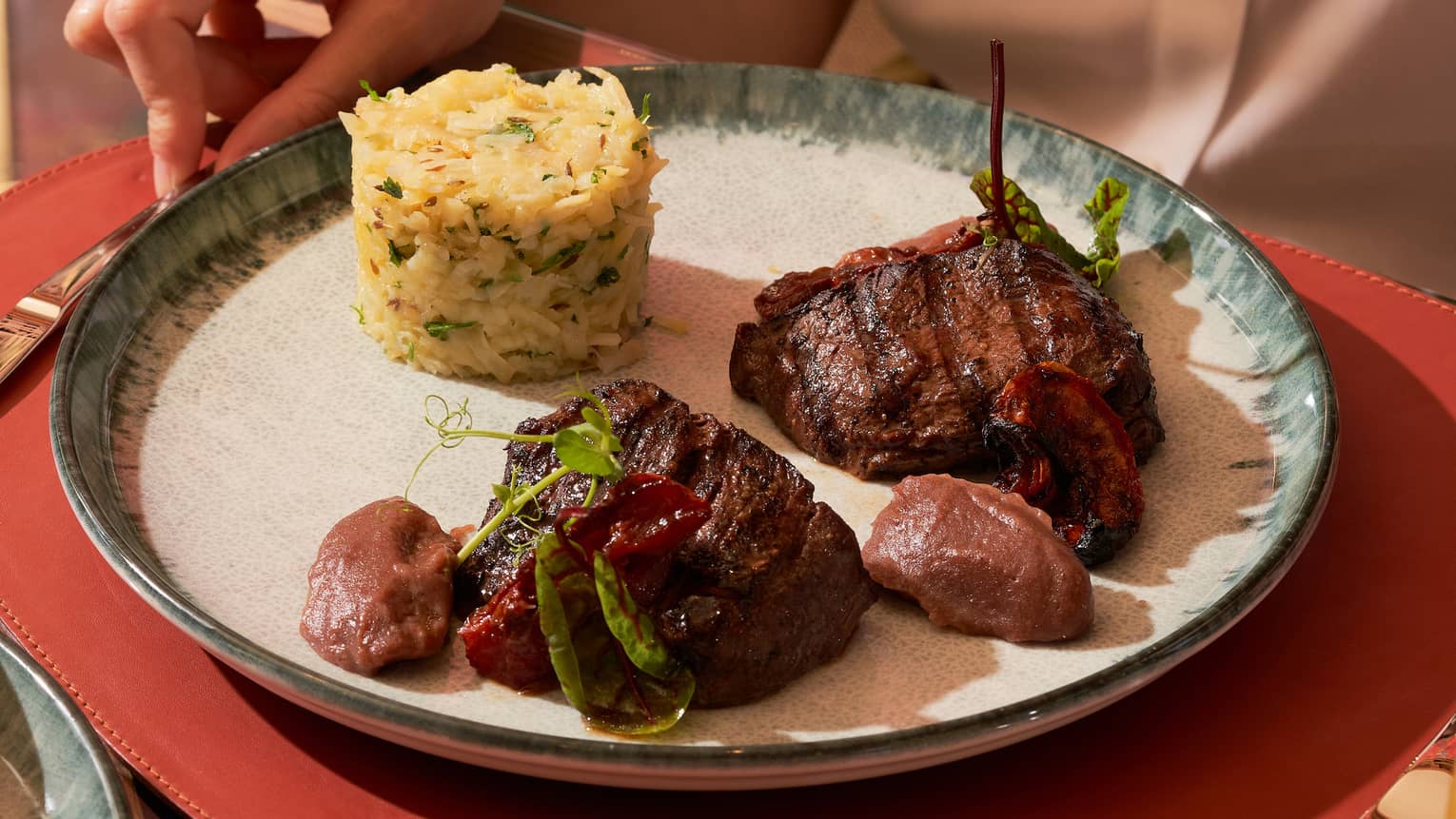 Arabesque MedallionSeared Beef Fillet, Date Coulis, Cumin Potatoes, Roasted Tomatoes, Herb Jus