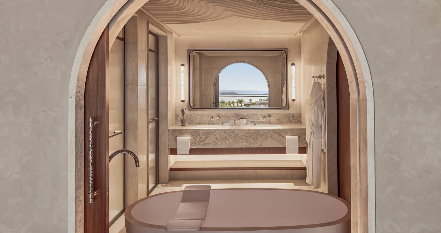 - Three full bathrooms with vanity, separate shower and free-standing tub, with sliding panel opening to the bedroom for natural light and sea views; primary bathroom with outdoor shower