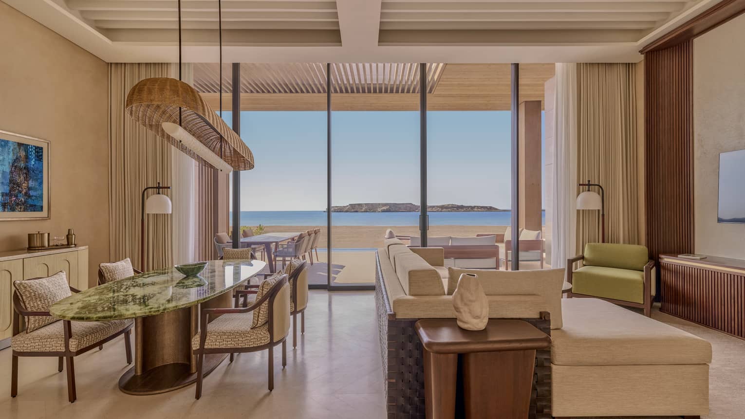 - Two full bathrooms with vanity, separate shower and free-standing tub, with sliding panel opening to the bedroom for natural light and sea views, plus access to outdoor sitting area
