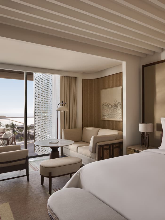 On higher floors with direct Red Sea views, this one-bedroom suite invites entertaining with a spacious living and dining room and furnished balcony. Your bedroom is a private wellness sanctuary with a luxe en suite bathroom.