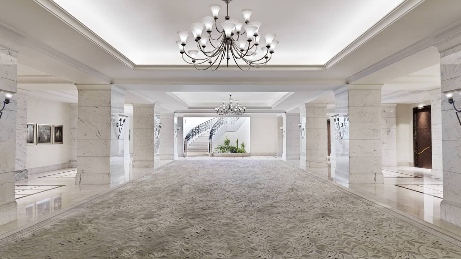 White marble and natural light combine to make the Grand Pre-function Area an atmospheric space for welcoming guests or a pre-dinner cocktail reception. It opens directly onto the terrace.