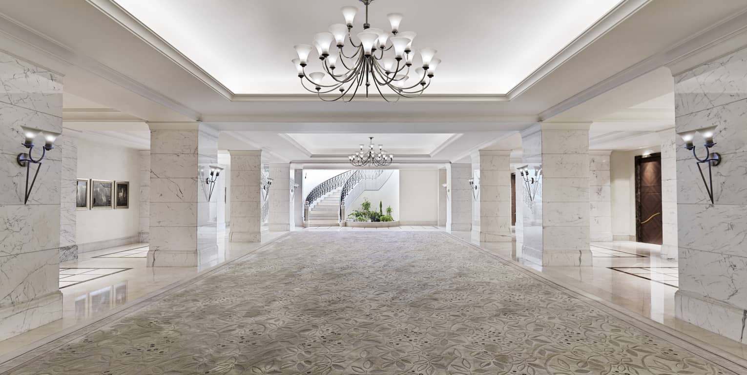 تتألق هذه المنطقة المطلة مباشرة على التراس بديكوراتها الفخمة من الرخام والإضاءة، بما يشعر الضيوف بالترحاب والراحة قبل الفعاليات على اختلافها