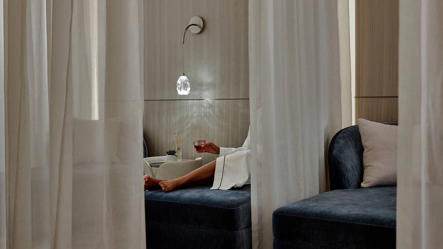 • A woman steps down into an indoor pool towards a man lounging while holding a yellow cocktail