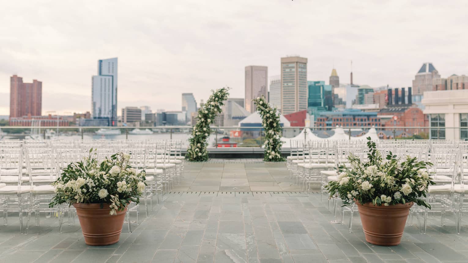 With fifth-floor 360° views of the skyline and stunning harbor sunsets, the Harbour Terrace offers one of the city’s most memorable outdoor ceremony settings. This open-air space with a reflective splash pool and waterfront vistas is the definition of a rooftop wedding in Baltimore, perfect for ceremonies and cocktail receptions of up to 100 guests.