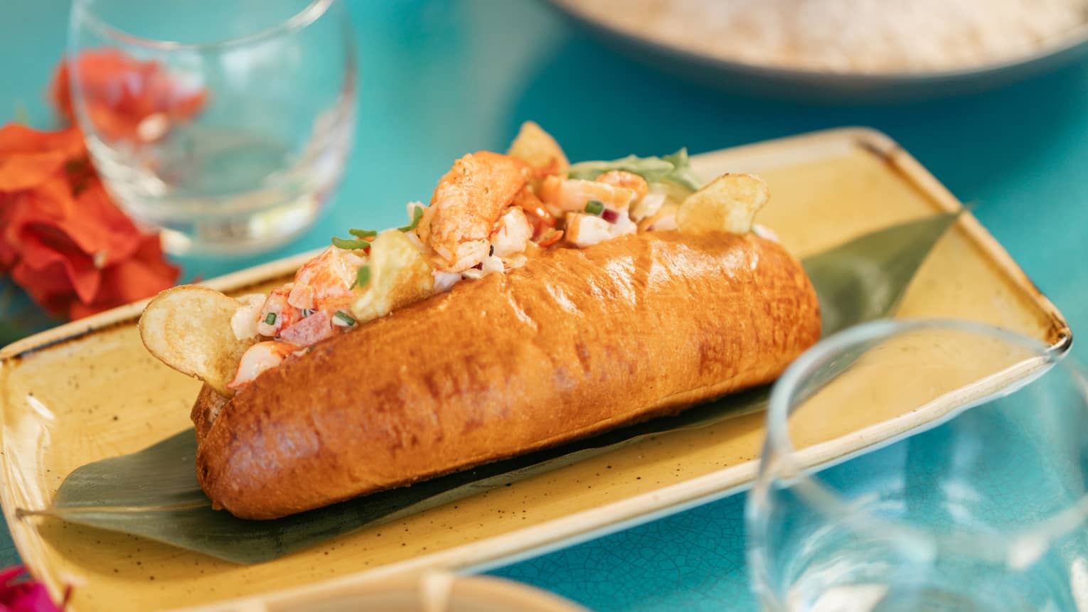 Prawn Coco Bread RollsHouse-Made Coconut Bread Rolls filled with Sichuan Peppercorn Prawns, Yuzu Mango Mayonnaise, Cos Lettuce, Julienned Tomato, Espelette Pepper and Lime Zest
