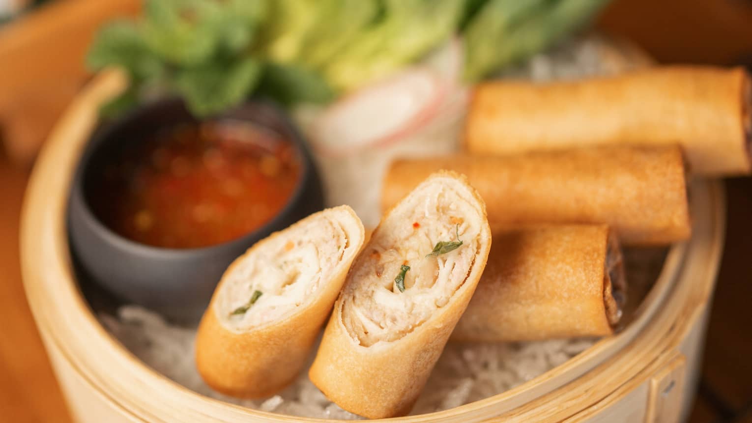 Vietnamese Nem RanFried Spring Roll, Mushrooms, Pork, Mint, Lettuce, Sweet and Sour Fish Sauce