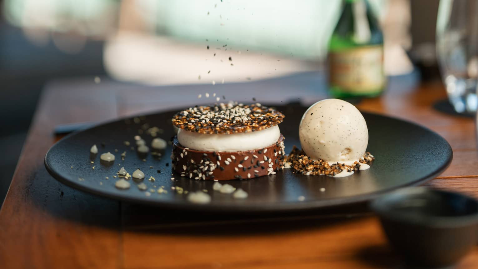 Chocolate & SesameChocolate Sponge Cake, Black Sesame Crunch, Chocolate Crémeux, Light Vanilla Mousse, Molten Sesame Praline, Dual Sesame Tuile, Vanilla Ice Cream