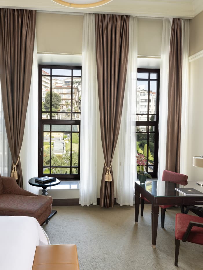 A spacious guest room overlooking the manicured courtyard as well as the Hotel’s grand entrance.