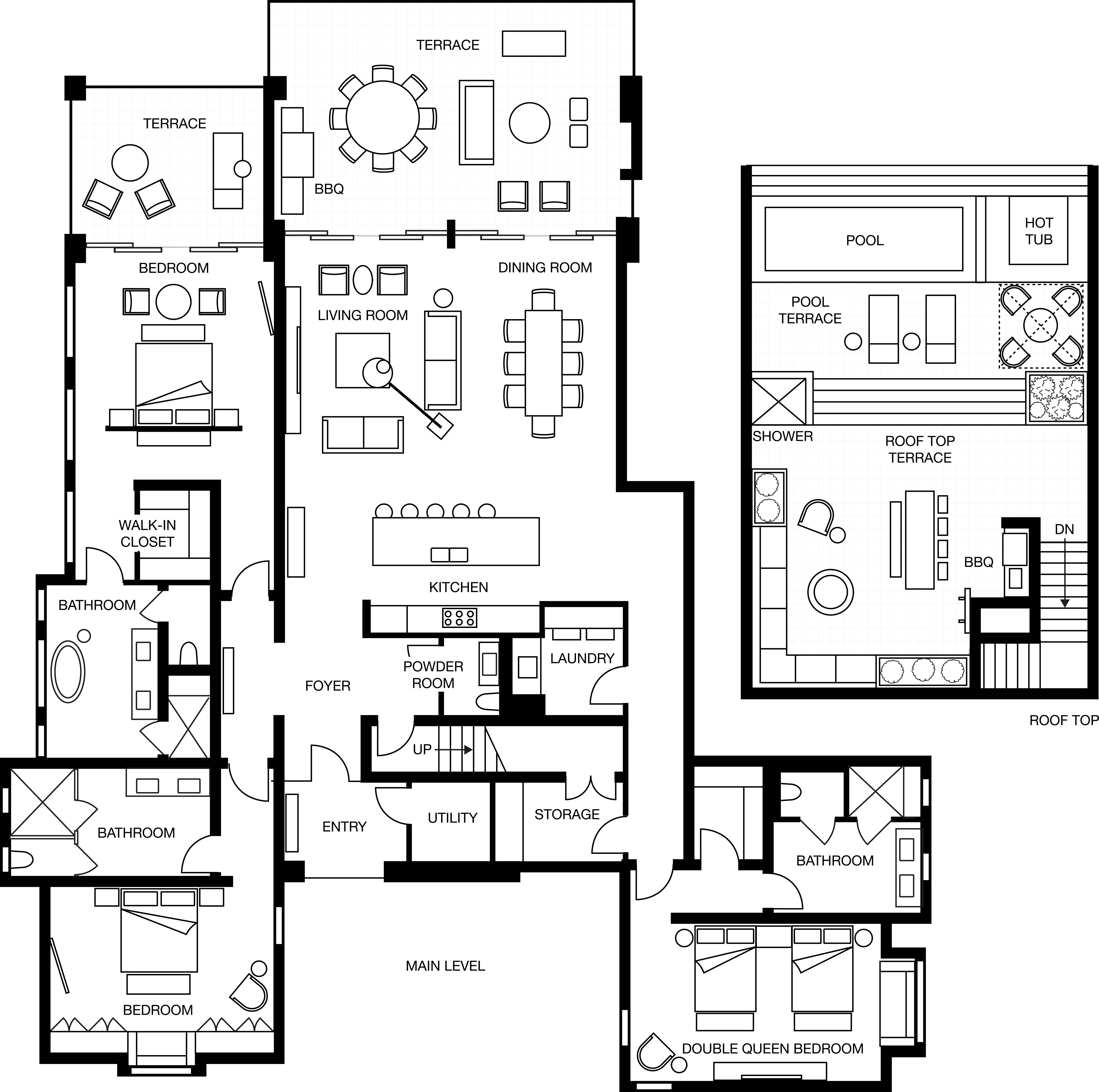 - Rooftop with lounge and dining areas, private pool and plunge pool