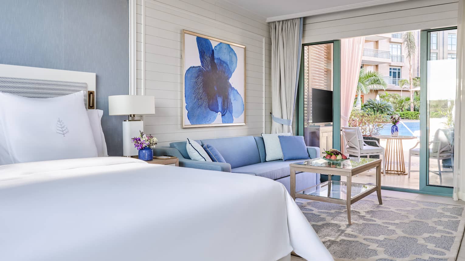 Blue, airy tones give this stylish room a breezy appeal, moments away from our pool oasis. Enjoy indoor-outdoor living all day, from lunch on the terrace to an afternoon nap in your cosy bedroom.