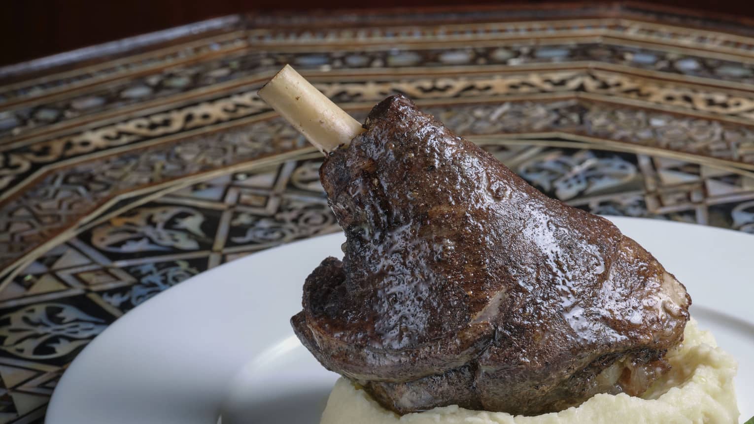 Fried lamb shankCinnamon Rice, Spicy Tomato Sauce