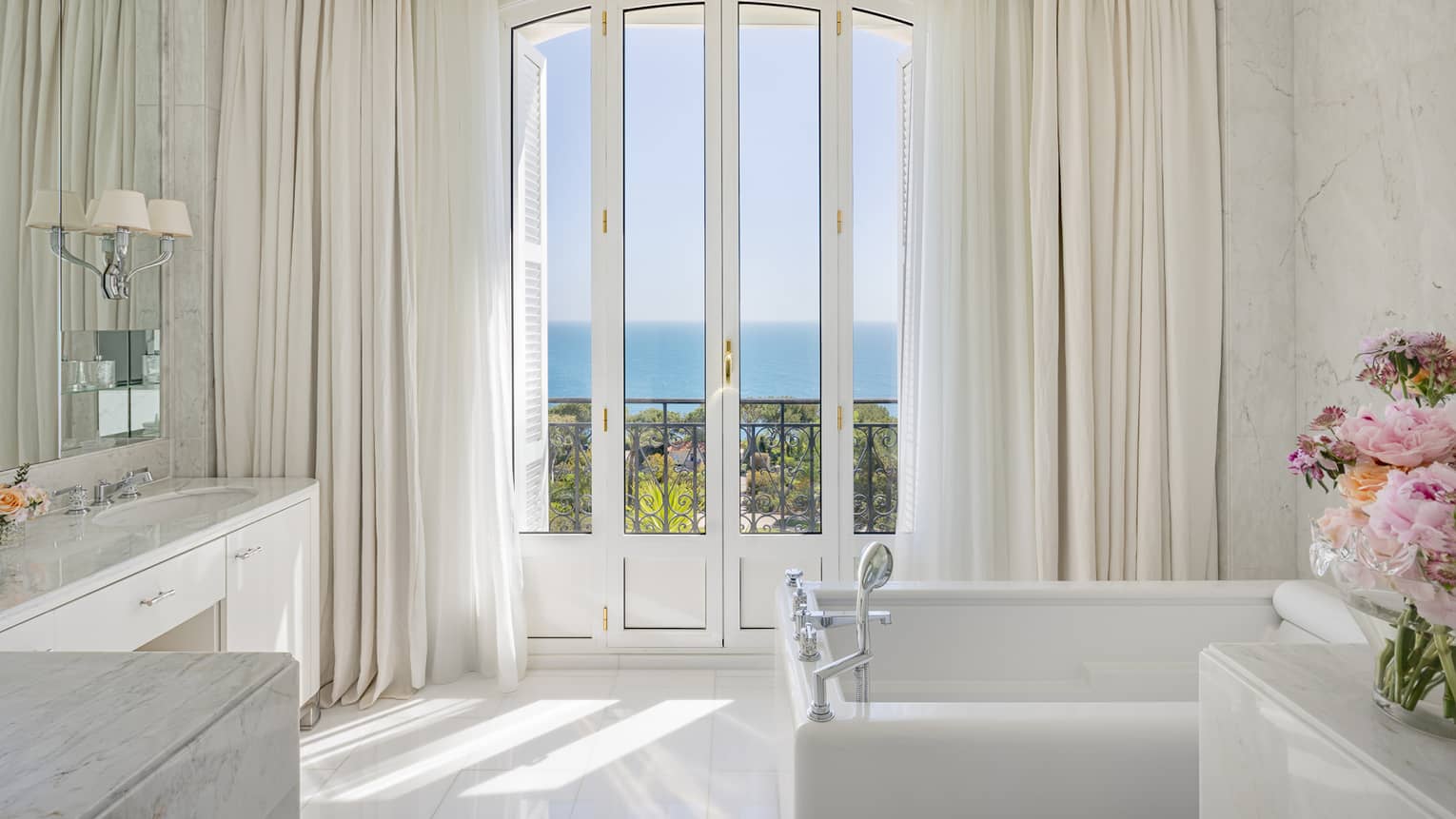 Our Cap-Ferrat Suite has large interior spaces bathed in sunlight. Soft tones typical of the Côte d'Azur echoe the view of the sea and gardens that’s framed by the large windows.