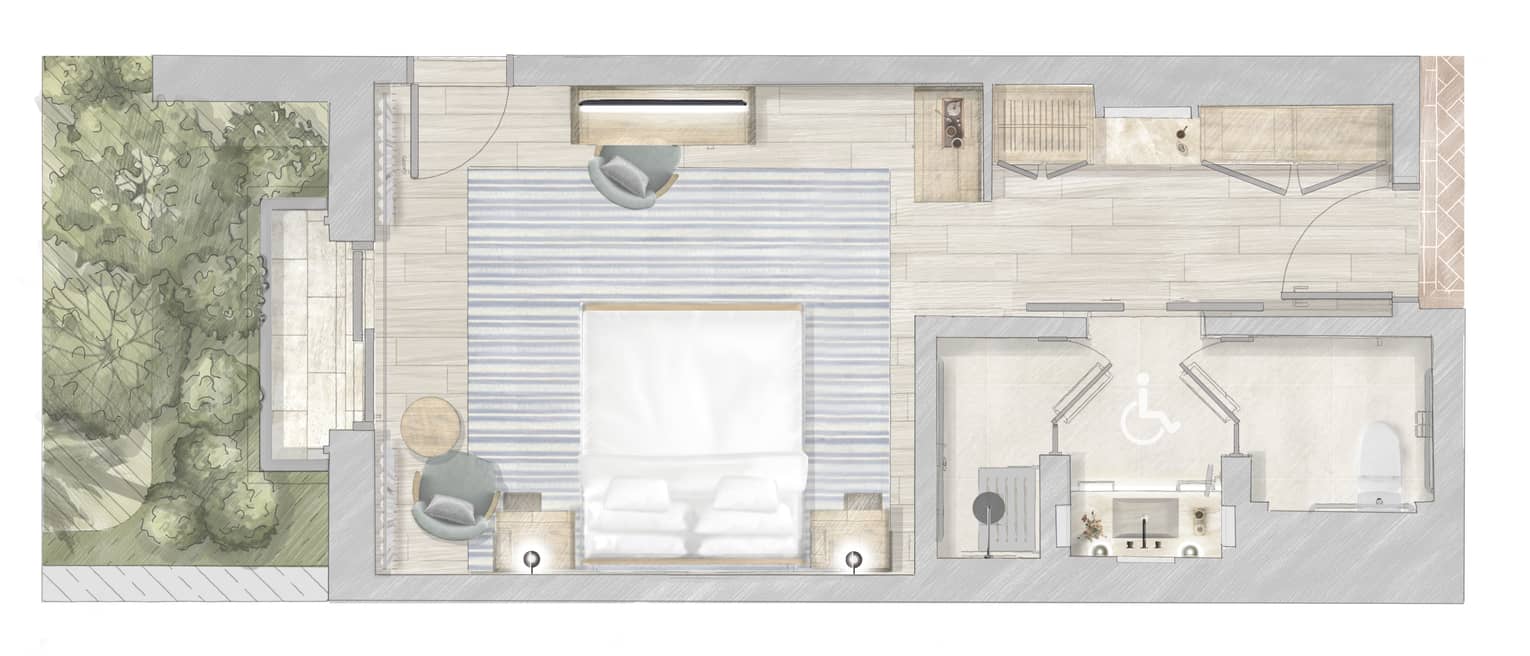 If you prefer contemporary décor, this light-filled guest room features modern abstract design in the woodwork, lamps, tables and carpeting. Enjoy fresh air and sunshine from the balcony or window railing, with views of the beautiful gardens at the heart of our Hotel.