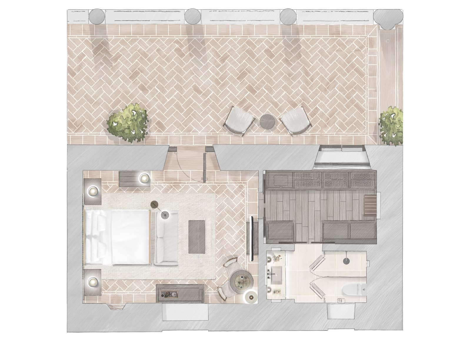 With stylish Colonial décor accented by rich dark wood details, this high-ceilinged guest room is windowless, offering extra quiet and total light control – ideal for sleeping late after an exciting night in Cartagena. Enjoy a truly tranquil retreat highlighting serenity and restfulness.