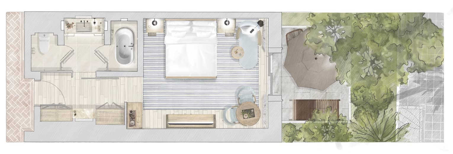 Find your favourite place to relax, whether in the chic contemporary interior or outside on your furnished terrace overlooking our courtyard gardens. Savour abundant natural light capturing the warm, tropical ambience of Cartagena.