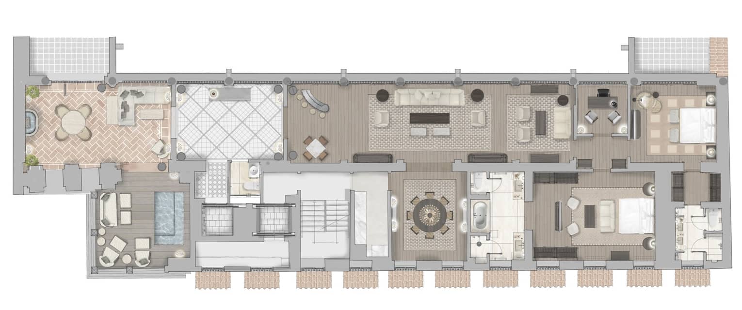 Named for the Hotel’s famed interior designer, François Catroux, this two-bedroom presidential suite is a modern vision of Colonial décor, with high ceilings and views of the gardens through historical arched windows. Accessed by private elevator, the suite features a spacious living area, office and separate dining room with pantry kitchen. On warm Cartagena nights, entertain outdoors on the furnished terrace complete with plunge pool.