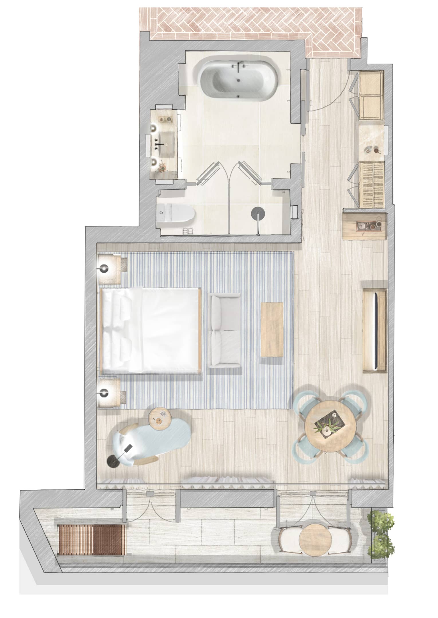 With a spacious, studio-style layout, this sun-filled suite provides abundant space to spread out and relax – inside or on the balcony overlooking the courtyard garden. Contemporary décor features abstract graphic design in the woodwork, curtains and carpet.