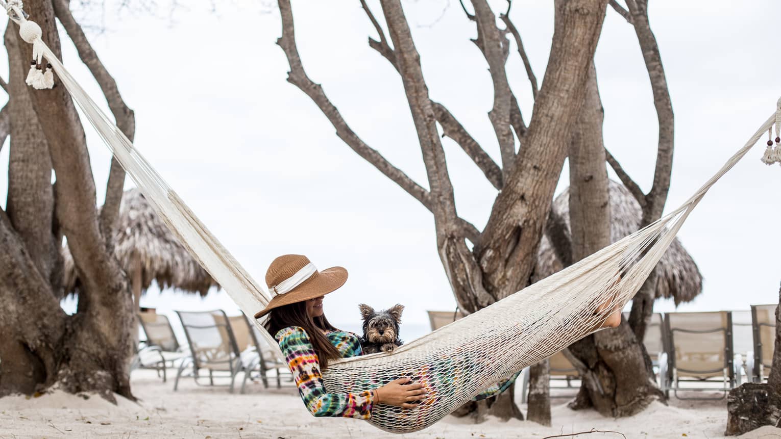 ![Woman in sun hat with legs dangling over side of hammock on patio, beside swimming pool]()