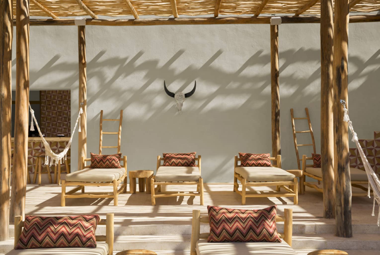 @puntamitalove ![Five white lounge chairs in a row on white sand beach near tide, buildings along cliff in background]()