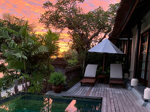 • Ocean sunset reflecting on private villa swimming pool, palm trees, thatched roof, lounge chairs