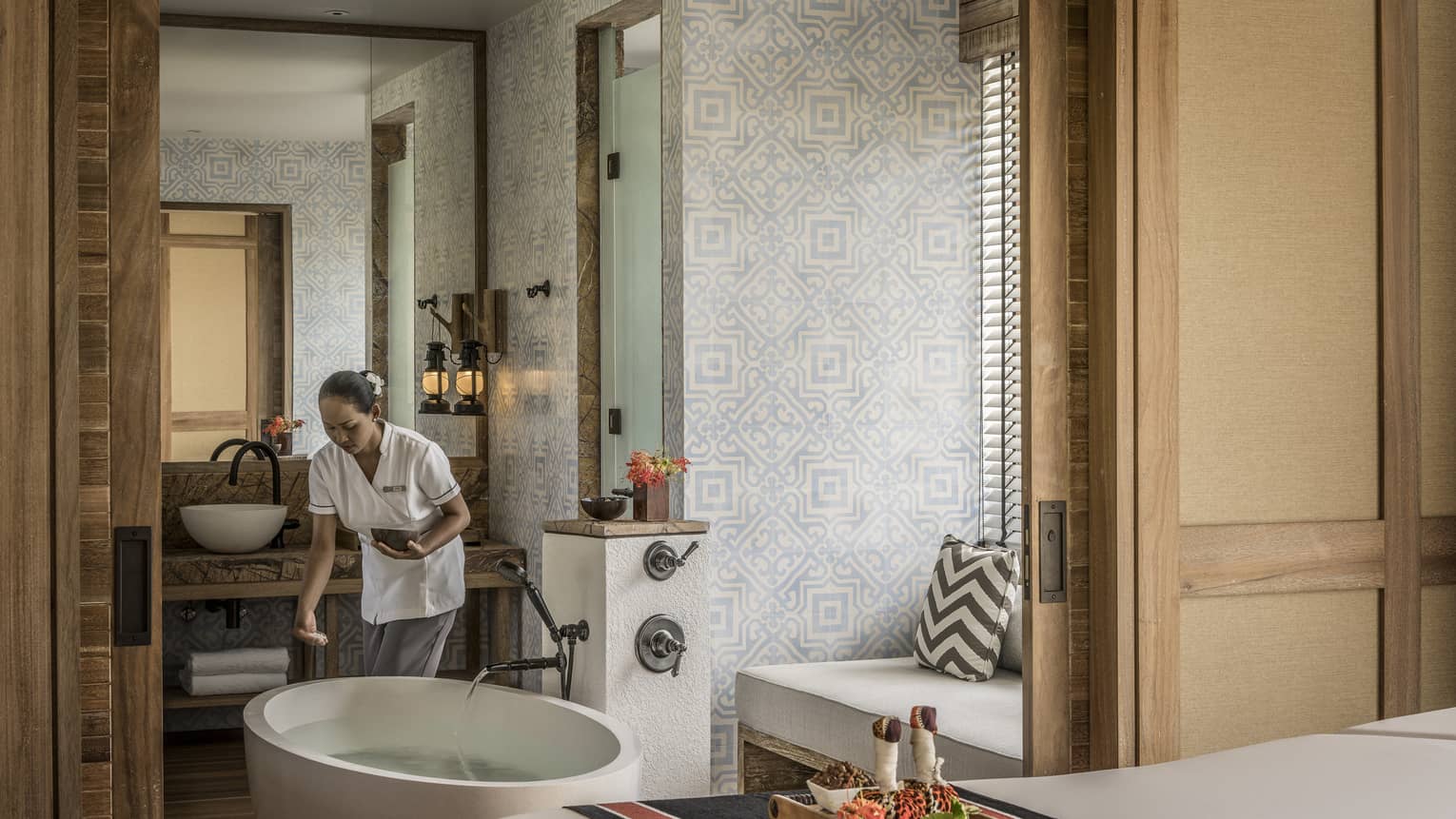 Sonnenstrahlen über der ovalen Badewanne einer Villa