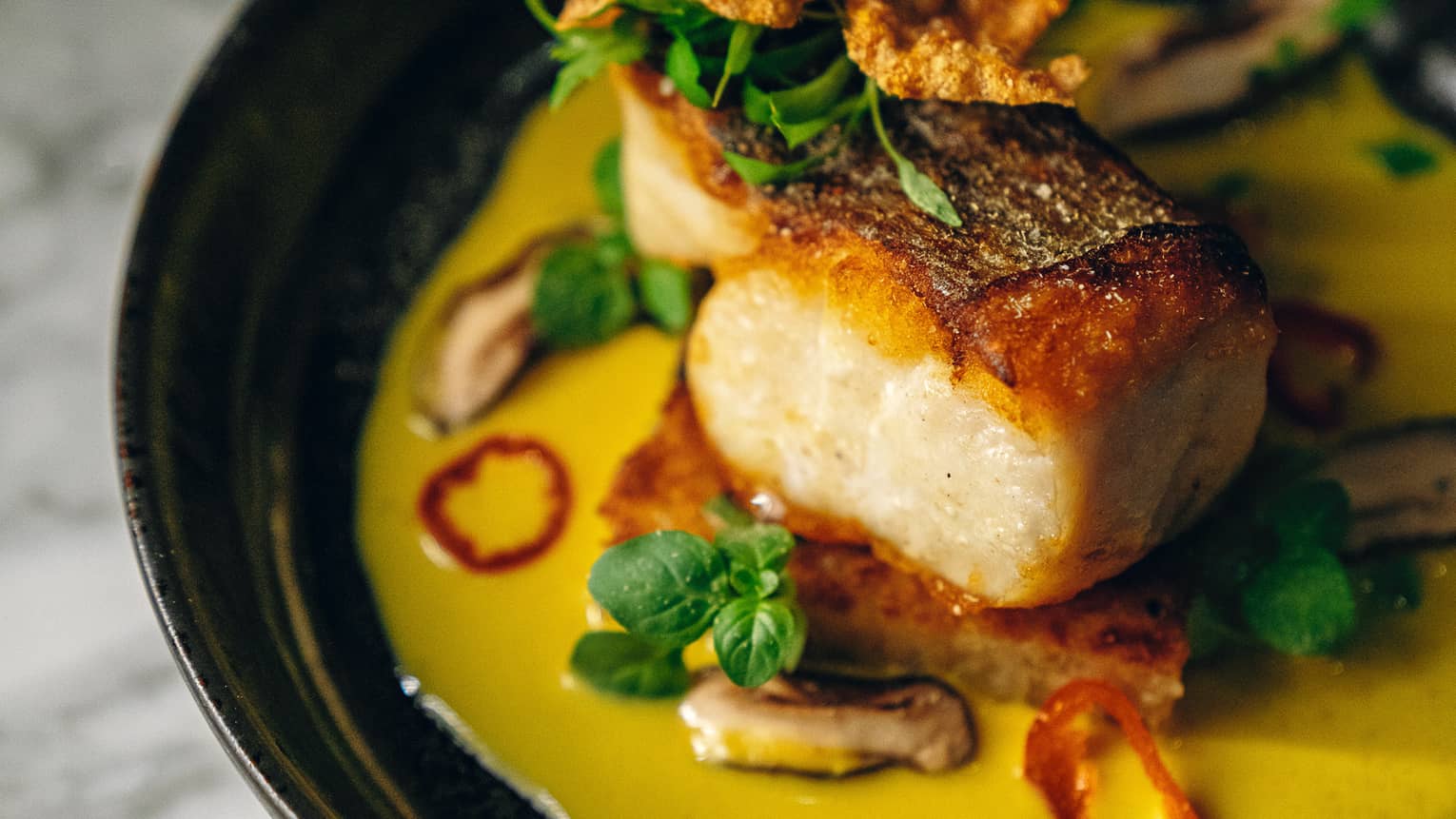 Sea BassCashew Coconut Curry Broth, House-Made Sticky Rice, Pickled Mushrooms, Fried Rice Crisp, Lemongrass Dust
