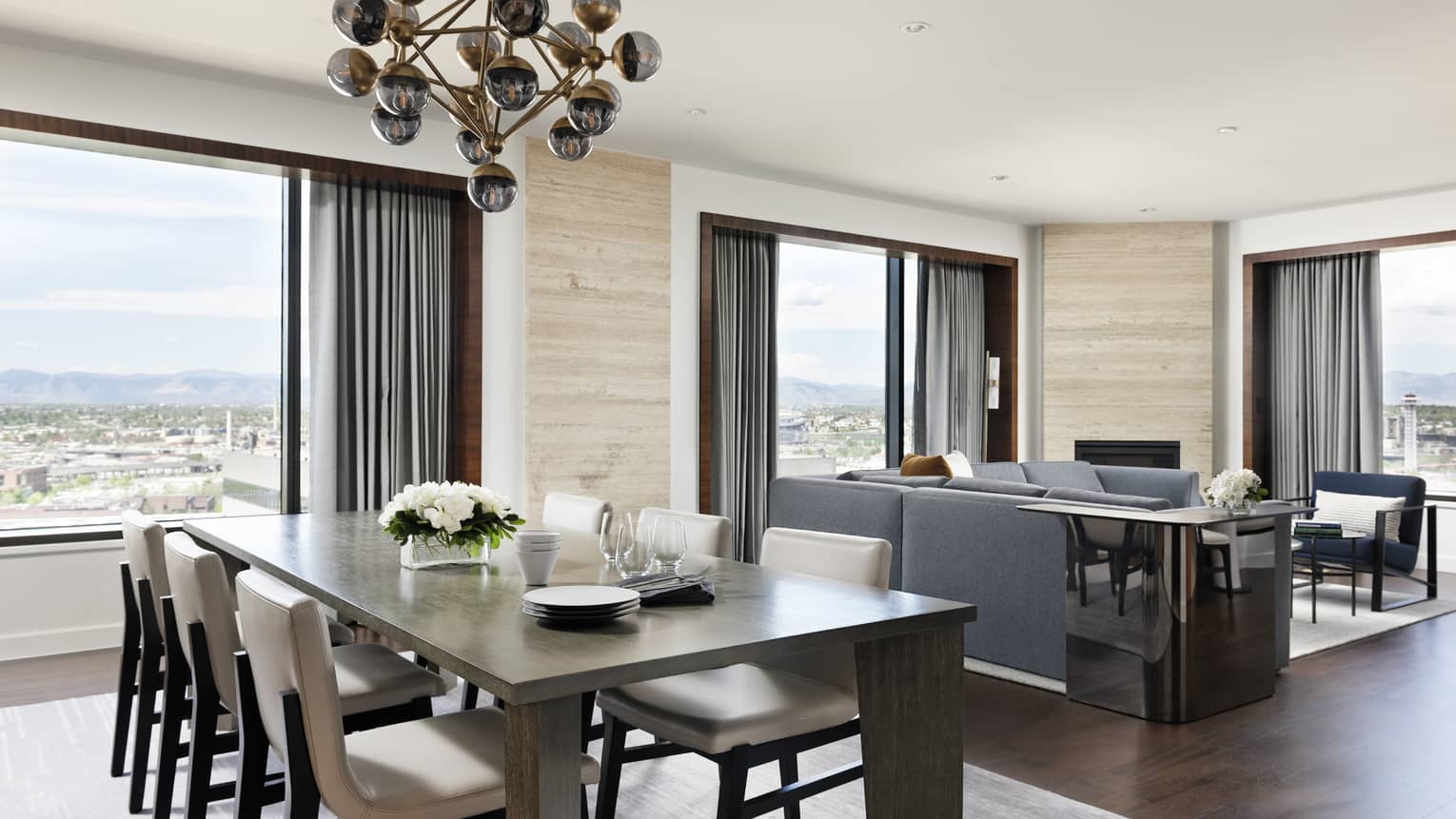 Panoramic views of the Mile High City and the Rocky Mountains from the corner living room of a Premier One-bedroom Suite