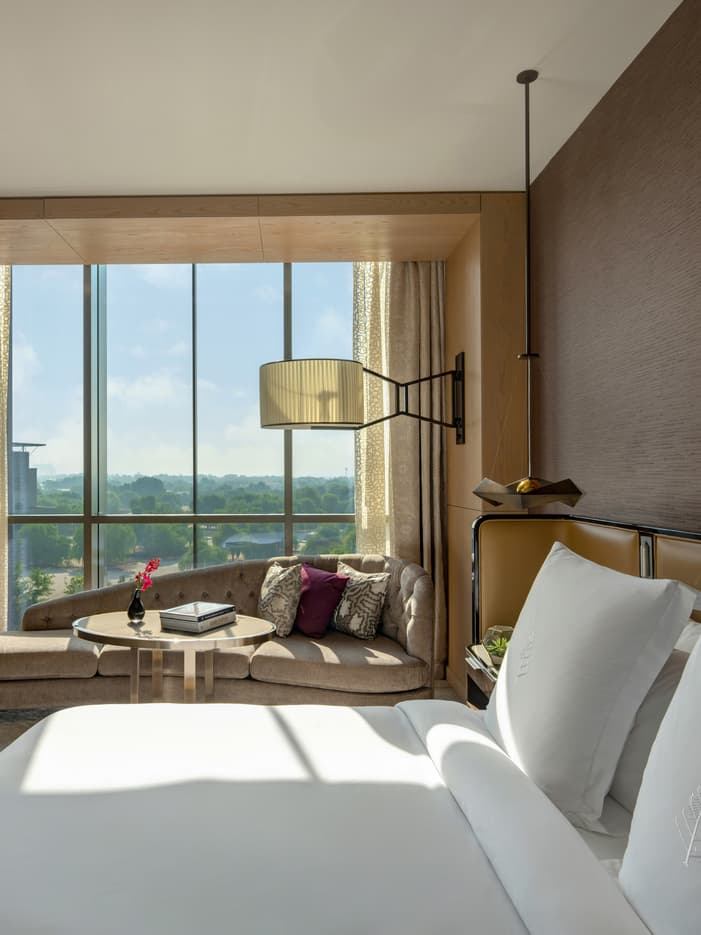 Wooden walls and modern furniture make this living space feel like a calm sanctuary. Relax with a freshly brewed espresso while overlooking the Zabeel Palace gardens or DIFC.
