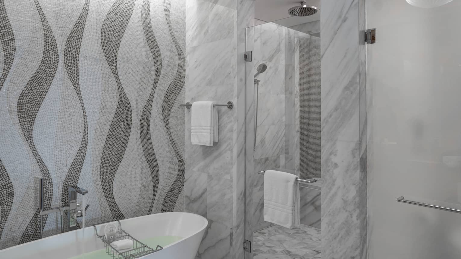 One full marble bathroom, plus guest powder room with shower