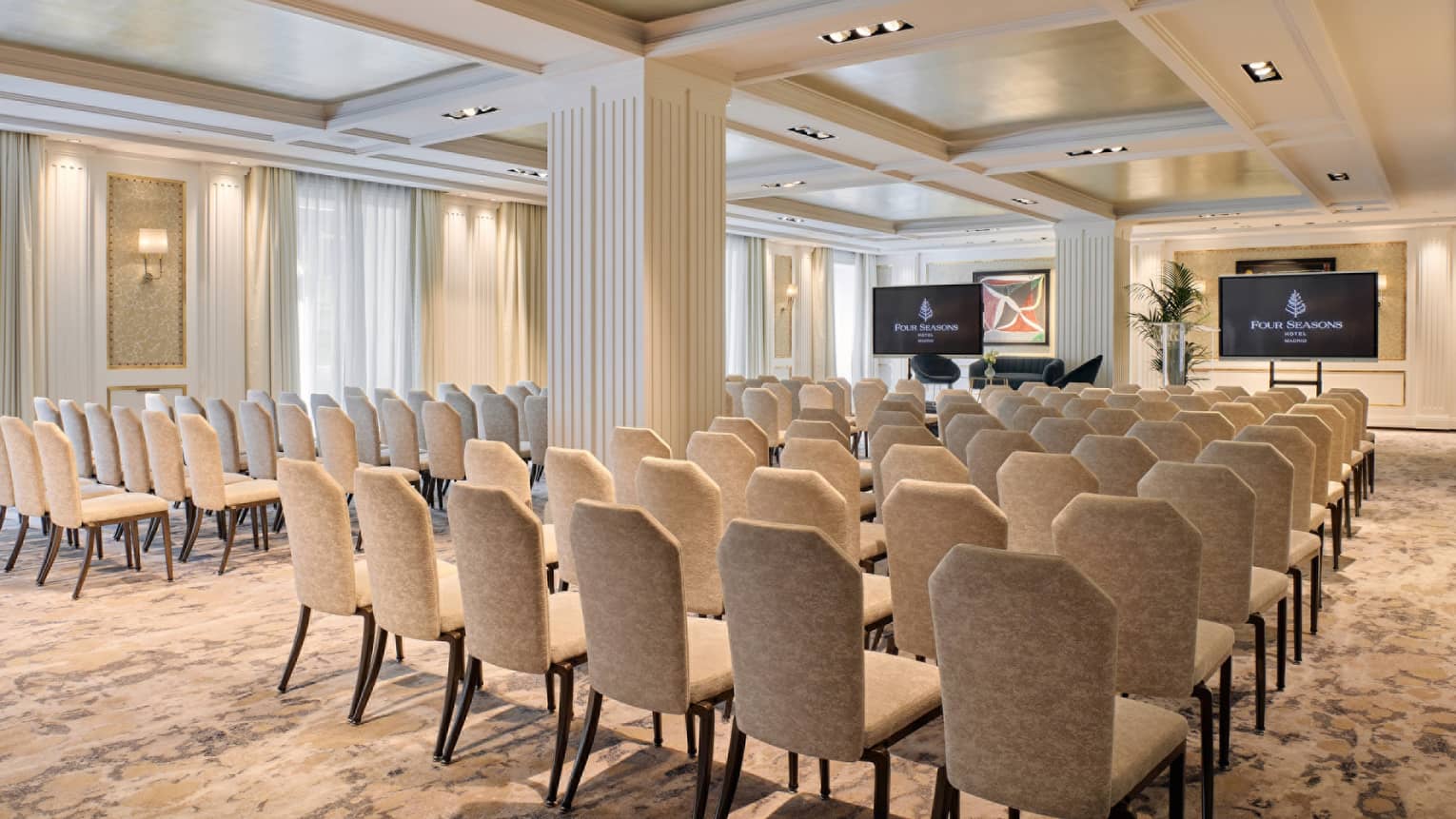 Salón Sol BallroomLas ventanas de suelo a techo y la decoración contemporánea y minimalista del Salón Sol de Four Seasons Madrid crean un entorno elegante y lleno de luz.