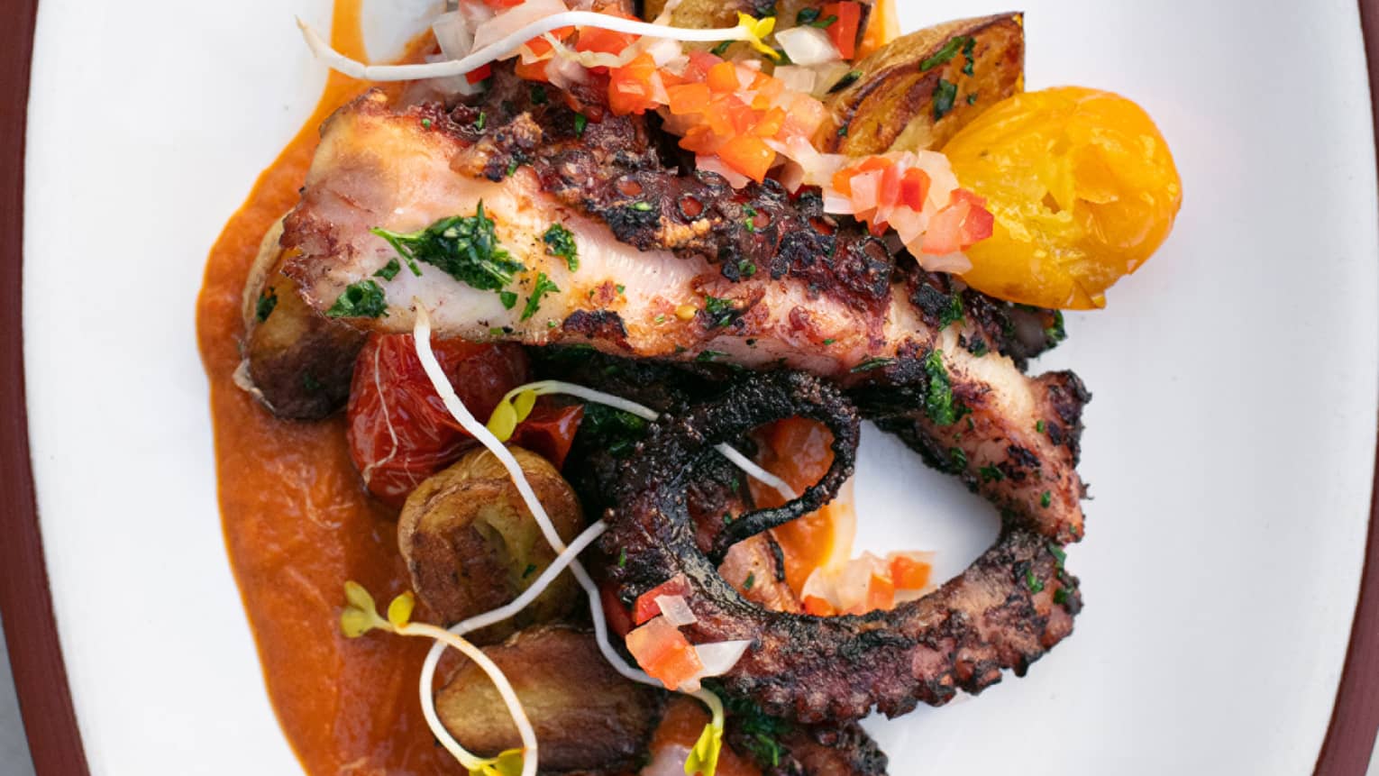Coliflor al curryCubierta con pasta de garbanzos, eneldo, vinagreta de avellanas y aguacate asado