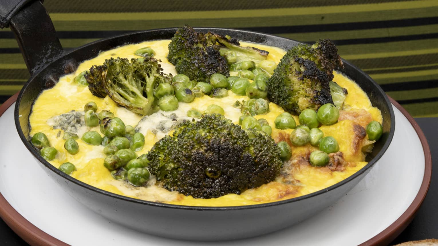 Pasta conchiglioServida con crema de maíz, brócoli, queso azul, ejotes y boconccinos gratinados