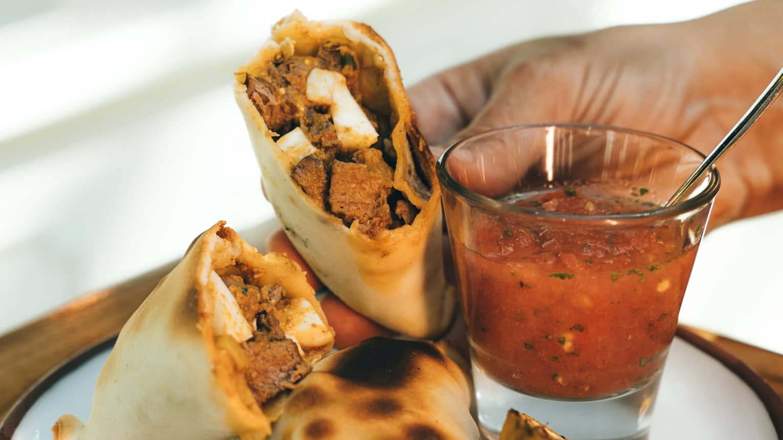 Ravioles de asadoBañados en salsa de tomate fresco y servidos con aceitunas kalamata y burrata