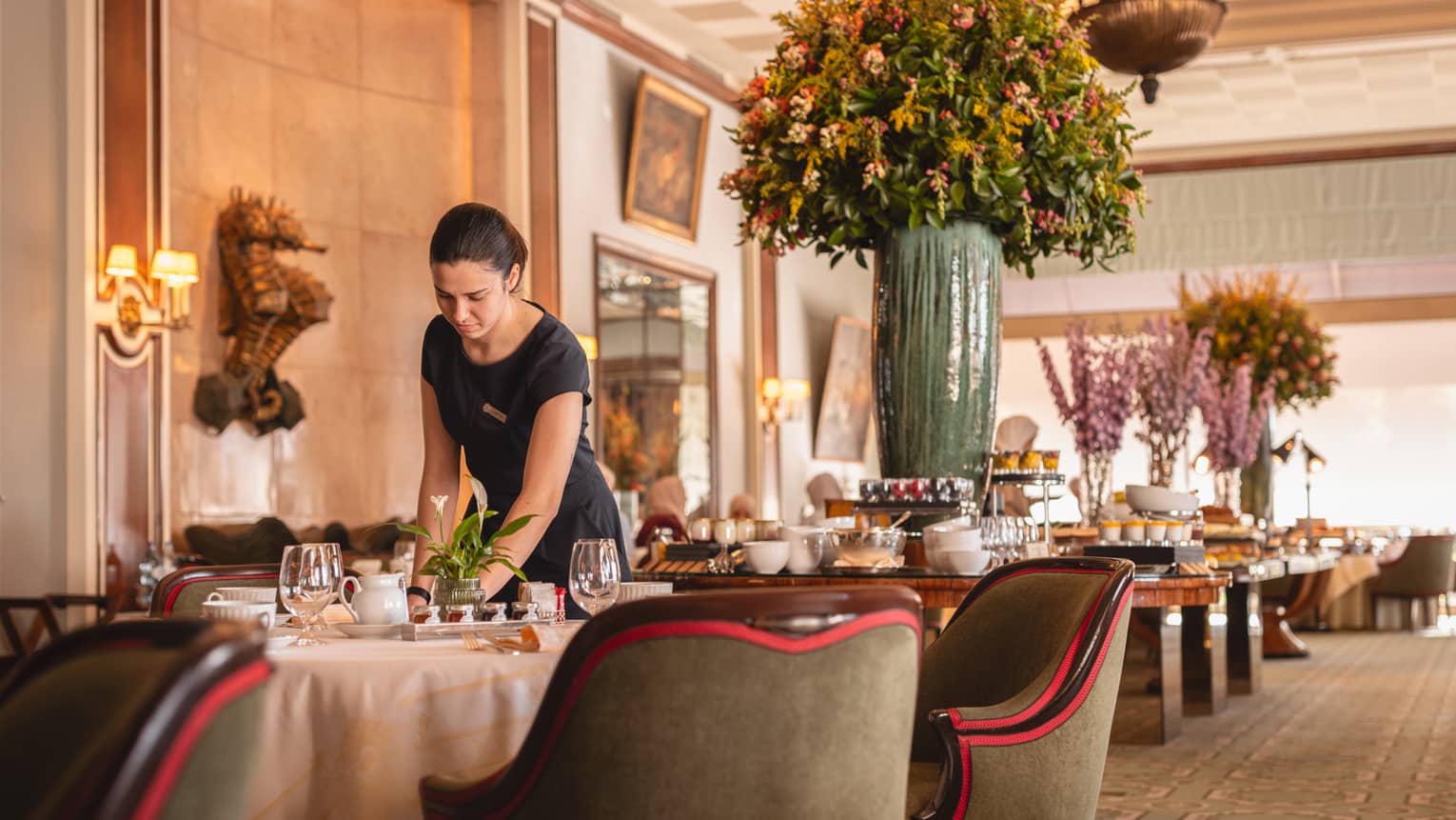 Flores de colores vivos complementan las obras de arte en Almada Negreiros Lounge & Bar