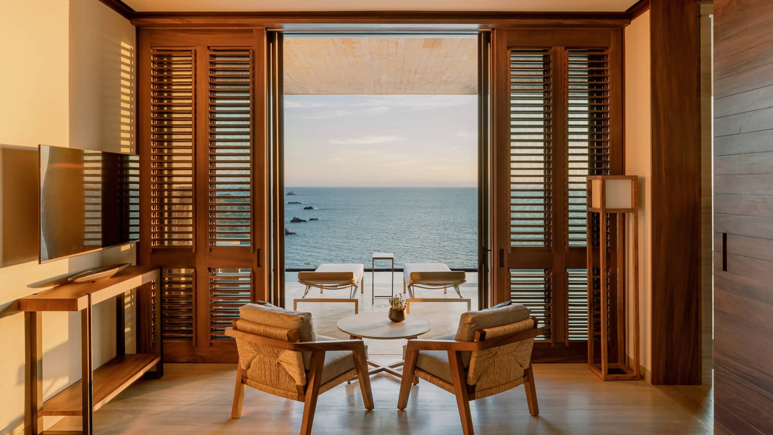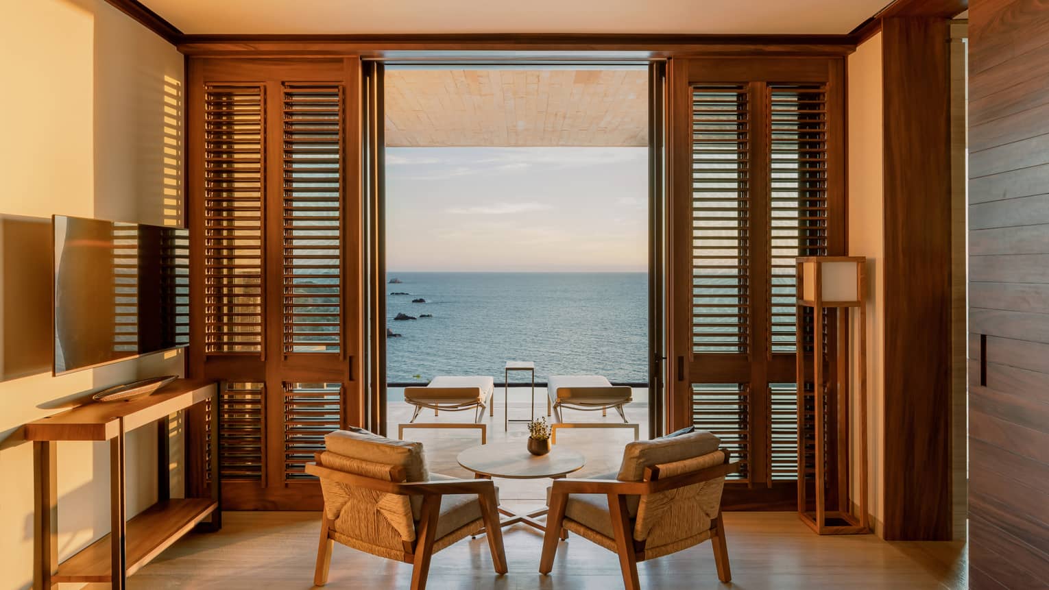 - Ventanas de suelo a techo con persianas de madera.