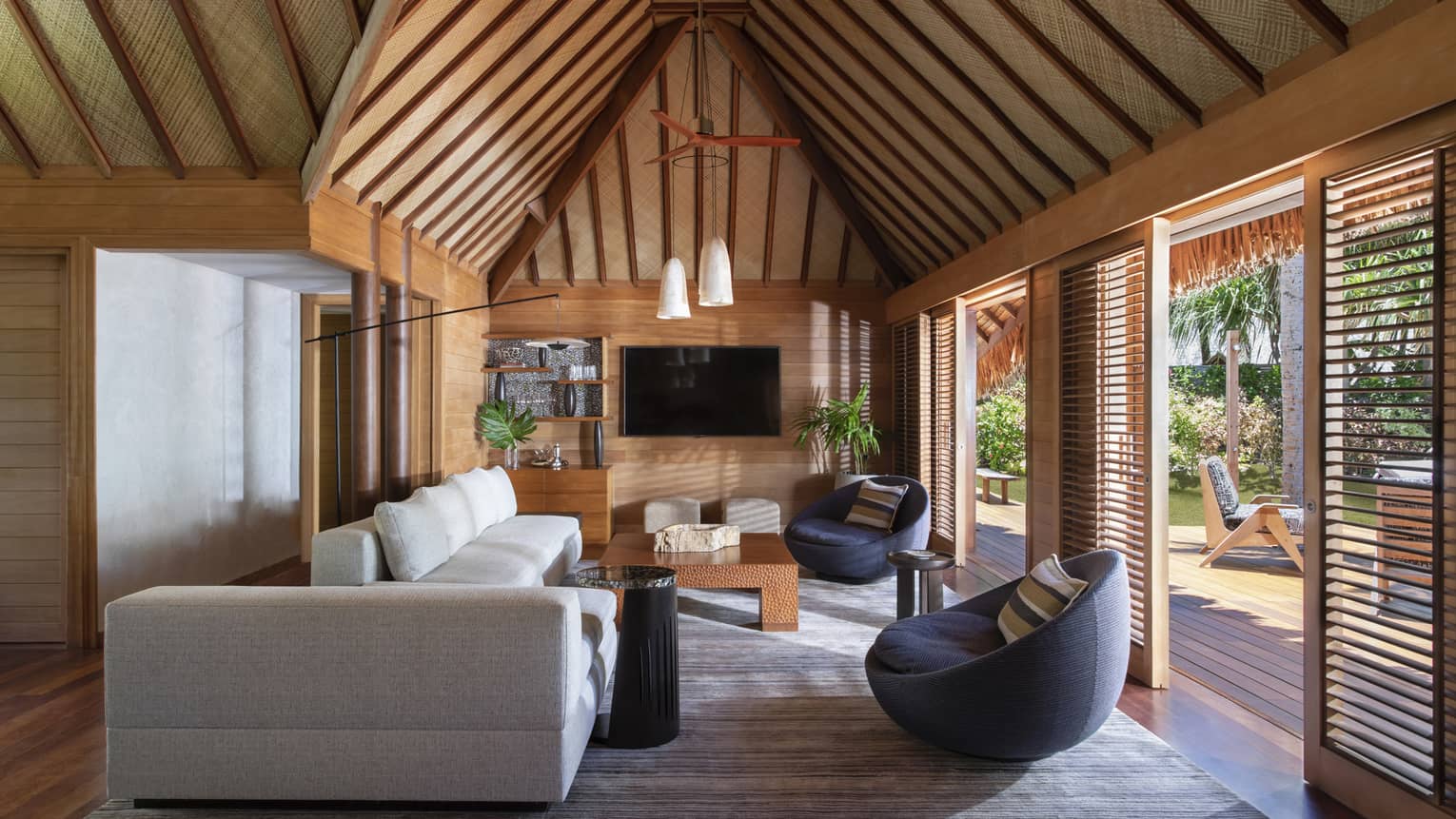 Entourées de tiarés (gardénias tahitiens) et de cocotiers verdoyants, ces villas romantiques offrent une vue incroyable sur le lagon et le mont Otemanu.