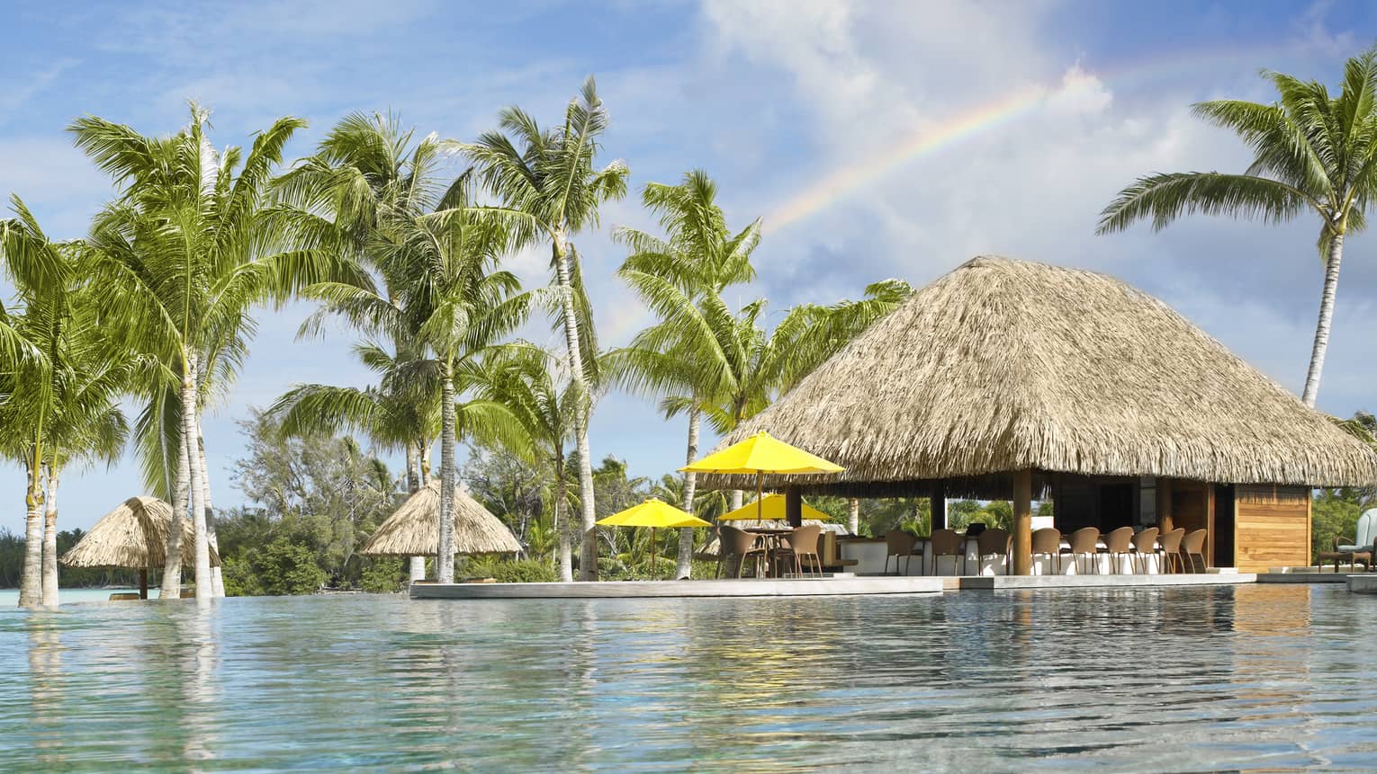 Ce lieu de réception en plein air donnant sur la plage et la piscine est propice aux conversations amicales. C’est le lieu de rendez-vous parfait pour prendre l’apéritif ou déjeuner le midi dans une ambiance décontractée. C’est également la plage idéale pour se retrouver lors d’un événement de groupe, avec sa vue exceptionnelle sur le célèbre mont Otemanu, et l’un des meilleurs endroits pour admirer le splendide coucher de soleil polynésien. Vous y serez aussi aux premières loges lors d’un feu d’artifice au-dessus du lagon.