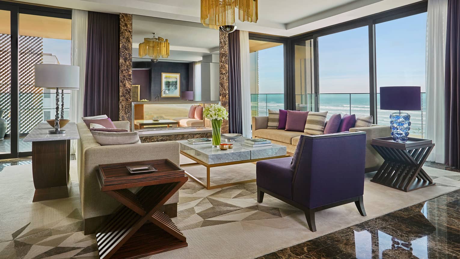 Située au cinquième étage de l'hôtel, la Suite Royale n'a pas d'égale à Casablanca. Elle offre une vue spectaculaire à 180 degrés sur l'océan ainsi qu'un vaste espace intérieur qui se prolonge à l'extérieur, permettant de profiter de la brise marine lors de vos soirées en famille ou entre amis. Vous souhaiteriez la transformer en suite à trois chambres ? Il suffit de nous le demander.