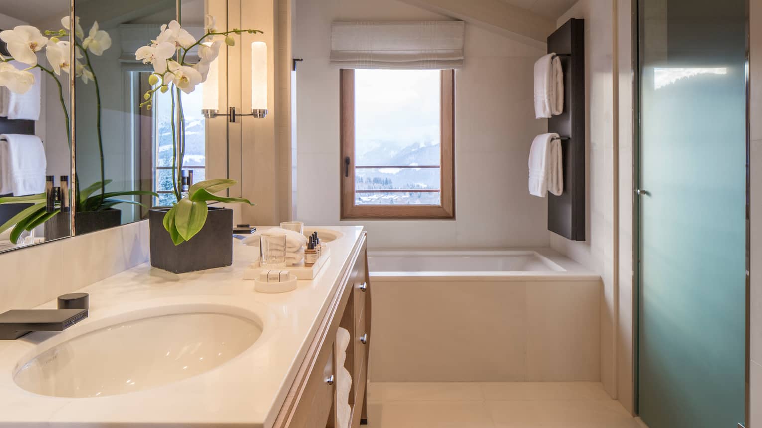 L'architecture de tradition alpine et le mobilier contemporain caractérisent cette suite lumineuse et spacieuse, qui offre des vues panoramiques sur la vallée depuis chaque fenêtre.