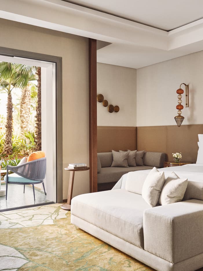 Spacieuse et baignée de lumière, cette chambre Deluxe s’ouvre sur un balcon aménagé offrant des vues à couper le souffle sur les piscines, la cour intérieure ou les majestueux jardins de l’hôtel. Son intérieur raffiné et chaleureux reflète la légendaire hospitalité marocaine.