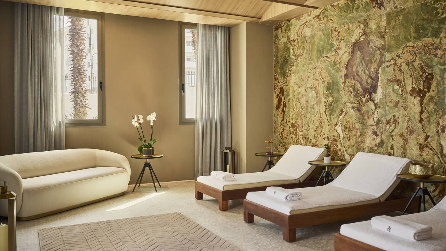 UN SANCTUAIRE ROYAL AU CŒUR DE LA VILLEDétendez-vous dans un lieu sublime signé Four Seasons, où modernité et tradition s’unissent en parfaite harmonie. Venez trouver la sérénité dans nos dix salles de traitement, toutes équipées de fenêtres donnant sur l’extérieur pour contempler, si vous le souhaitez, le ciel bleu et les rayons du soleil de la « ville lumière du Maroc ». Prolongez ensuite votre expérience avec quelques brasses dans notre piscine intérieure avant de vous abandonner à la chaleur enveloppante de notre hammam traditionnel marocain. Découvrez un sentiment de détente absolue signé Four Seasons, expert dans l’art du bien-être et de la relaxation.