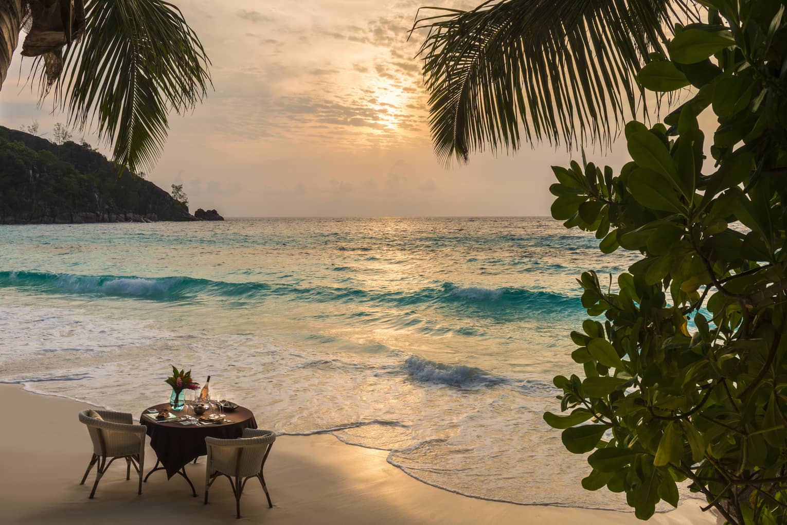 Dîner à la plage pour deuxLe coucher de soleil sur l'océan et les douces vagues qui touchent presque vos pieds nus vous donneront l'impression d'être les deux seules personnes au monde lors d'un dîner privé sur la plage de Petite Anse.