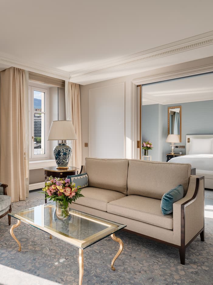 Bright and airy, the Suite Léman welcomes you into a spacious one‑bedroom retreat, where soaring ceilings and expansive windows frame uninterrupted views of Lake Geneva. Soft pastel tones of light blue and beige, echoing the serene palette of Lac Léman, create a calming, refined atmosphere, showcasing the signature French elegance of renowned architect Pierre‑Yves Rochon. Designed as an inviting residential space, the suite’s generous living room unfolds with a natural sense of ease, ideal for quiet relaxation or unhurried moments shared with loved ones.