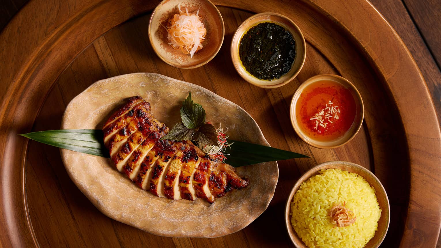 GÀ NƯỚNG THAN HOACharcoal-Grilled Free-Range Chicken, Mac Khen, Ginger Nuoc Cham, ST25 Rice
