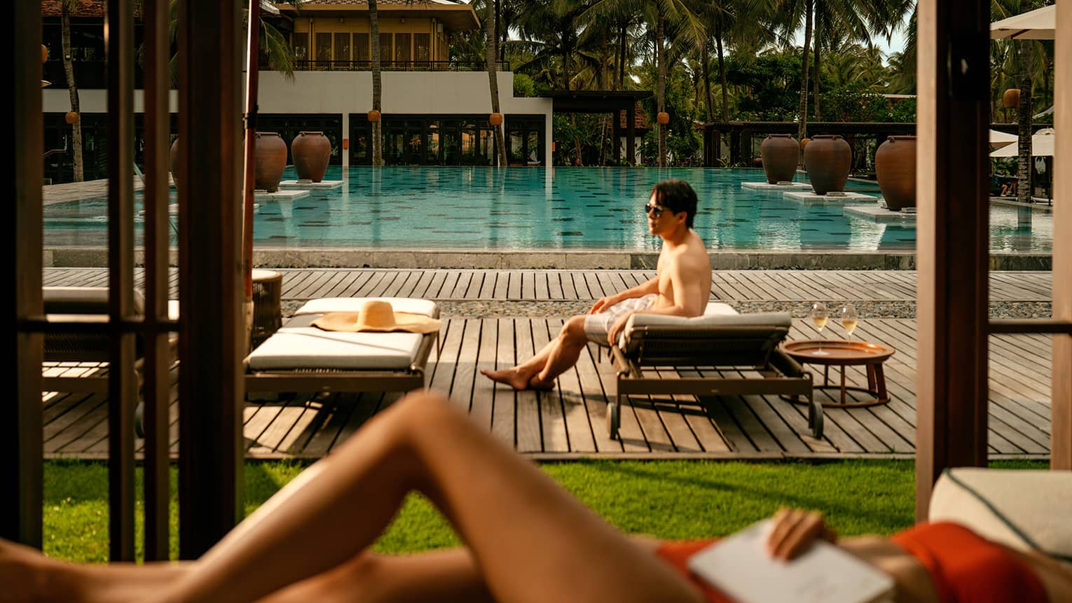 Our newly renovated One-Bedroom Villa provides a serene retreat in which to slow down and spend quality moments together during Tet. A sleeping pavilion draped in sunset hues invites deep rest with a garden-view bathtub and outdoor rain shower for scenic bathing rituals.