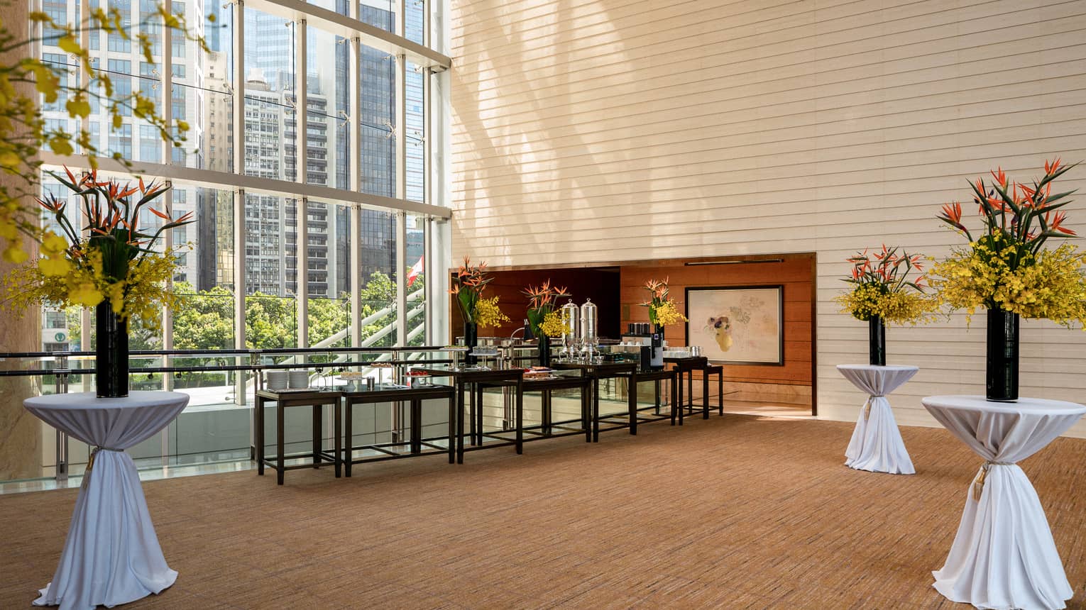 Set the stage for the main show with a welcome reception or pre-event cocktails in our Four Seasons Grand Ballroom Pre-Function Area, where sunlight spills into the space through six-storey windows, creating an inviting atmosphere.