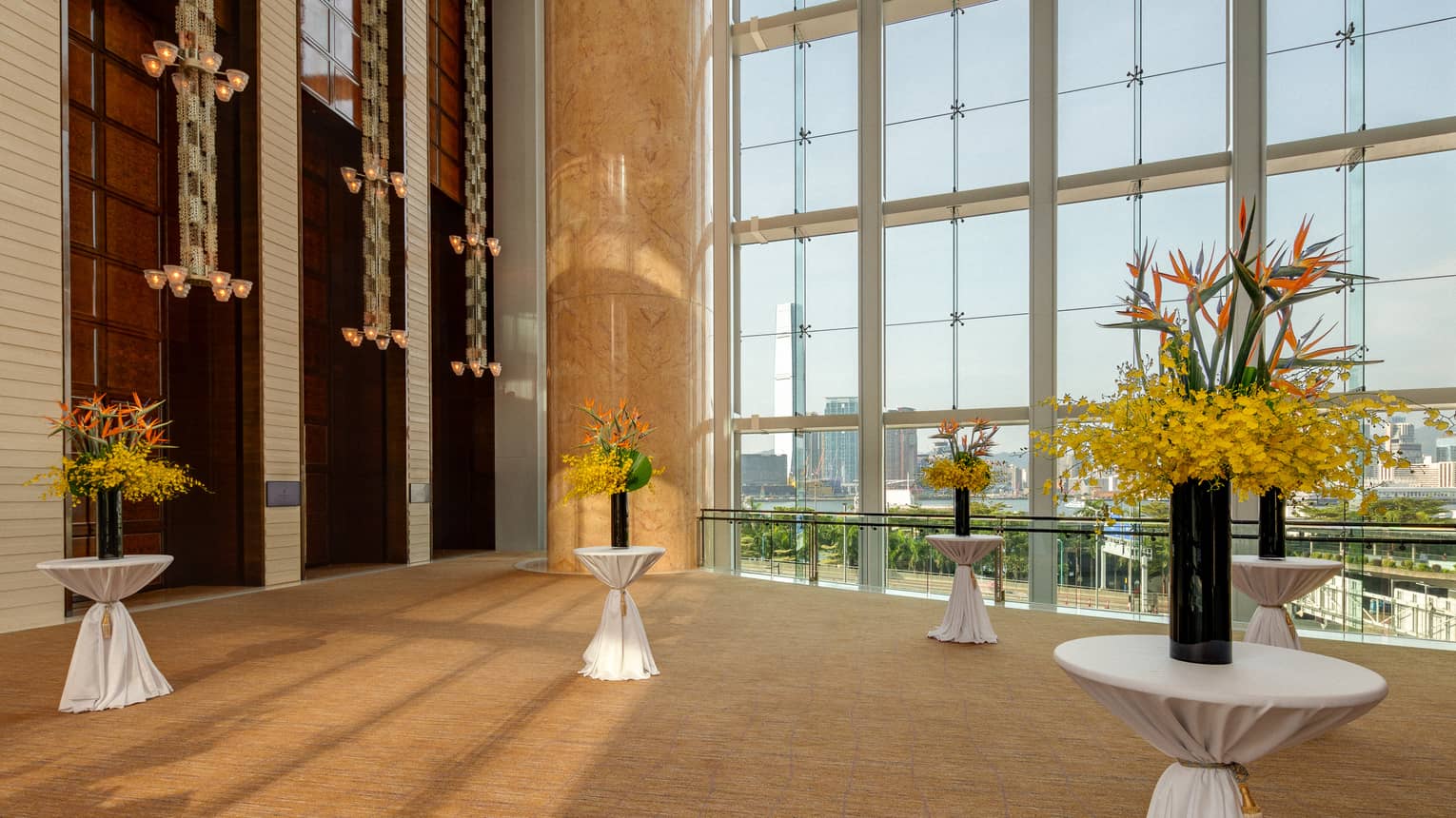 Set the stage for the main show with a welcome reception or pre-event cocktails in our Four Seasons Grand Ballroom Pre-Function Area, where sunlight spills into the space through six-storey windows, creating an inviting atmosphere.